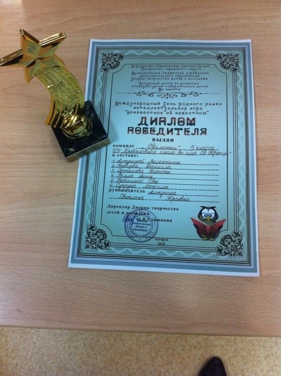 Поздравляем победителей интеллектуальной игры «Неизвестное об известном», посвященной Международному дню родного языка, которая состоялась 14 февраля во ДТДиМ. Команда учеников 5 класса заняла 1 место (учитель Алтунина С.Ю.), команда учеников 4 класса 3 место (учителя Музыченко И.В., Мирошникова С.С.)