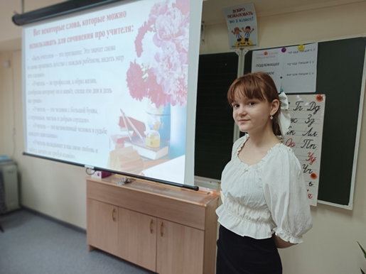 «В день Учителя у нас прошли необычайно интересные уроки. Мы писали сочинение «Мой любимый учитель». Я волновалась и в тоже время радовалась. Все прошло идеально!»