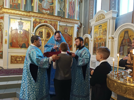 Гимназический храм ещё в процессе строительства, поэтому сейчас гимназисты распределяются по храмам города: обучающиеся 5-10 классов молились и причащались Святых Христовых Таин в Свято-Троицком храме (настоятель - протоиерей Владимир Килин), а воспитанники 1-4 классов - в храме в честь Успения Божией Матери (настоятель - протоиерей Георгий Слизов).