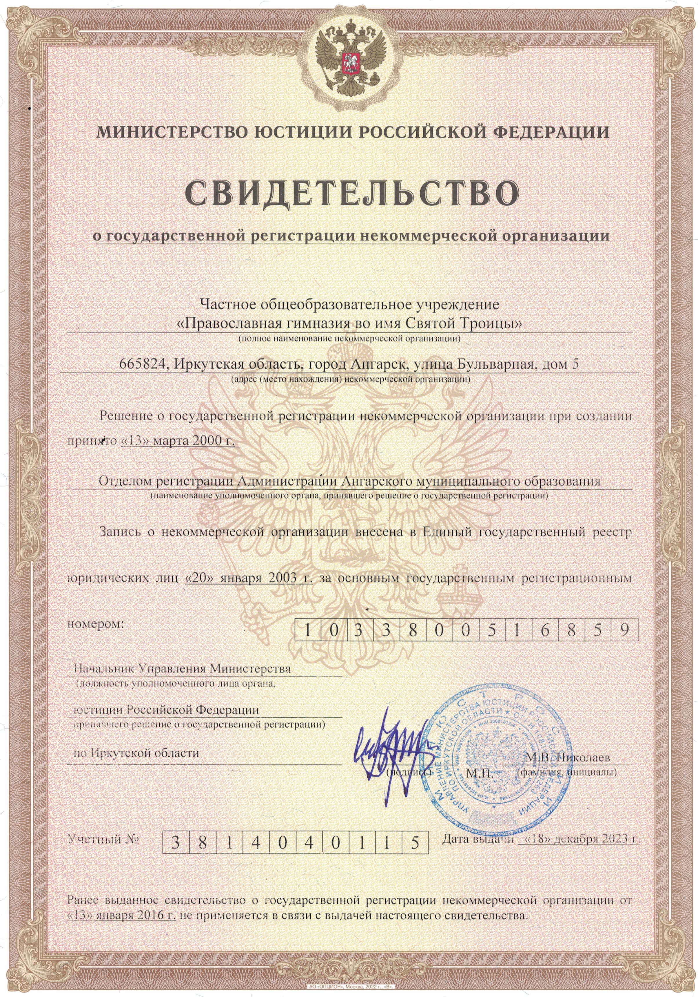 Полное наименование организации: Частное общеобразовательное учреждение «Православная гимназия во имя Святой Троицы»
